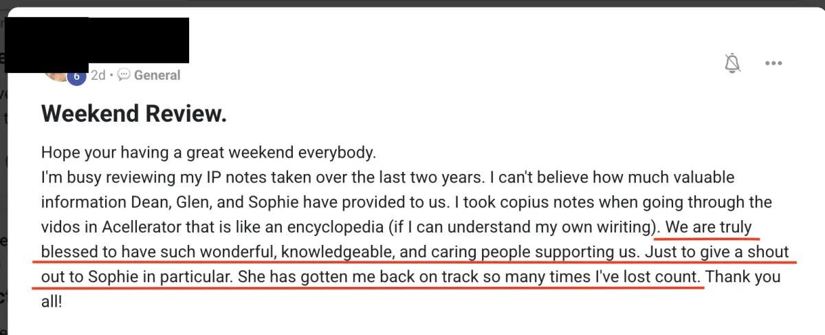 Dean has a thriving community of people building online businesses, and it's an honour to help them. I love working with Dean and my colleague Glenn - whether it's answering questions on coaching calls, helping out in the community or organising live events and workshops.